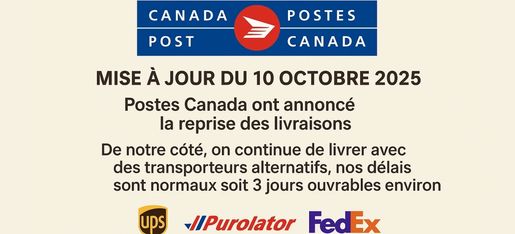 10 octobre 2025: Nos opérations tournent normalement pour la majorité des adresses au Canada nous respectons nos délais habituels. Nous expédions via des transporteurs alternatifs. Poste Canada ont annoncé le retour des livraisons de manière progressive.